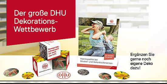 Teilnahmebedingungen: Der Veranstalter dieses Preisausschreibens ist die Deutsche Homöopathie-Union DHU Arzneimittelfabrik GmbH & Co. KG, Ottostraße 24, 76227 Karlsruhe. Teilnahmeberechtigt sind nur Angehörige der Heilberufe sowie Apothekenpersonal ab 18 Jahren mit Wohnsitz in der Bundesrepublik Deutschland. Die Teilnahme ist kostenlos. Die Übermittlung der einzusendenden Bilder erfolgt online über das DHU Fachkreisportal. Sofern nach Ansicht des Veranstalters ähnlich attraktive Abbildungen von Dekorationen eingesendet wurden und die Anzahl der Gewinnpreise überstiegen wird, entscheidet das Los. Die Teilnahme über Vertreter oder die Übertragung der Teilnahme auf Dritte ist ausgeschlossen. Der Rechtsweg ist ausgeschlossen. Die Gewinner werden schriftlich benachrichtigt. Eine Barauszahlung des Gewinns ist nicht möglich. Die Fotos der Schaufenster und Namen der Apotheken werden unter www.dhu-fachkreise.de veröffentlicht. Teilnahmeschluss: 31.10.2022. Diese Nutzungsbedingungen können jederzeit von der Deutsche Homöopathie-Union DHU Arzneimittelfabrik GmbH & Co. KG, Karlsruhe ohne gesonderte Benachrichtigung geändert werden. 1118/bw/424528/1300/0522